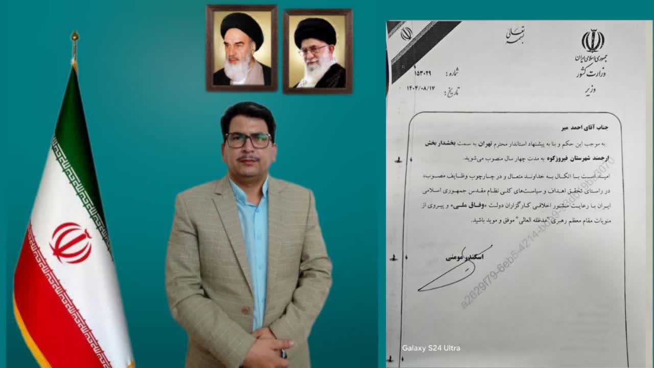 به گزارش روابط عمومی فرمانداری فیروزکوه در قسمتی از حکم وزیر کشور آمده است: امید است با اتکال به خداوند متعال و در چارچوب وظایف مصوب، در راستای تحقق اهداف و سیاست های کلی نظام مقدس جمهوری اسلامی ایران با رعایت منشور اخلاقی کارگزاران دولت " وفاق ملی" و پیروی از منویات مقام معظم رهبری "مدظلهالعالی" موفق و موید باشید.